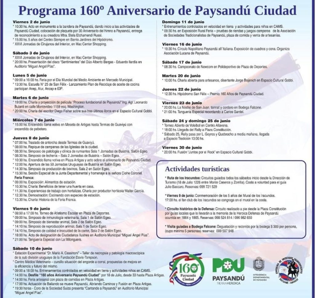 Este año se conmemora el 160 aniversario de Paysandú ciudad y los 30 años del himno a Paysandú y para celebrarlo habrán actividades durante todo el mes !!